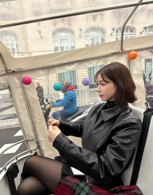 공개된 사진 속 카리나는 심플하면서도 시크한 블랙 가죽 재킷에 블랙 원피스를 매치해 도회적인 무드를 연출했다.