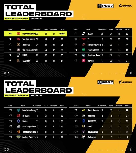 그룹 스테이지 2일 차 B/C조 경기를 치른 결과, 데이트레이드 게이밍(DAY)이 89킬과 순위 점수 39점 도합 128점을 획득해 1위를 차지했다. 킬 포인트만으로 4위 디 익스펜더블스(TE)의 전체 점수인 89점을 확보한 이들은 파이널 진출은 물론, 그룹 스테이지 전체 1위도 사실상 확정지었다.