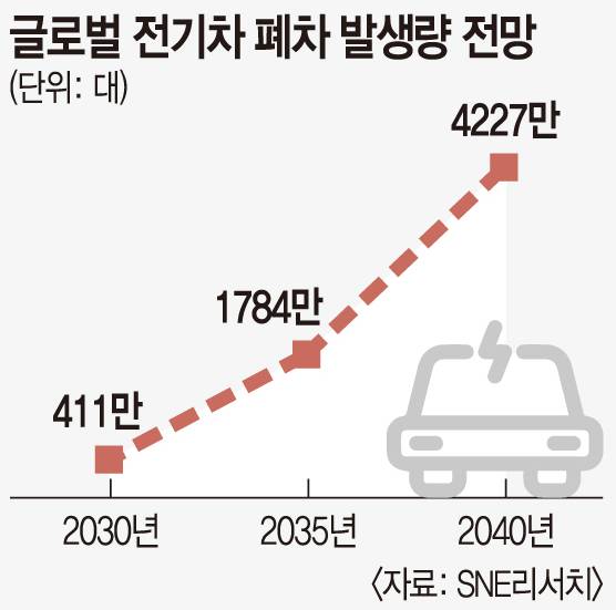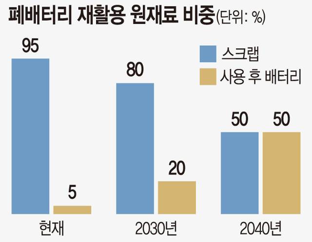 최근 이 같은 구도에 변화가 감지된다. 전기차 시장이 개화하면서 폐배터리 발생지의 중심이 생산공장에서 소비시장으로 이동할 것으로 예상되면서다. SNE리서치는 지난 2023년 17만대에 불과했던 전기차 폐차량이 2030년 411만대, 2040년 4227만대로 증가할 것으로 추산했다. 이에 따라 폐배터리 재활용 원재료 중 사용 후 배터리가 차지하는 비중은 2030년 20%, 2040년 50%로 늘어날 전망이다.