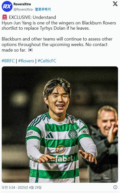 블랙번 로버스 소식에 정통한 영국 매체 '로버스엑스트라'는 29일(한국시간) "블랙번이 타이리스 돌런(23)의 대체자로 양현준을 노리고 있다"며 "아직 구단 간 공식 협상이 이뤄진 단계는 아니"라고 밝혀 화제가 됐다.