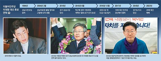 2004년 3월 경기 성남시 수정구 주민교회 지하 기도실. 바닥에 앉아 있던 40세의 이재명 변호사(현 더불어민주당 대선 후보)는 노동조합 활동가 정해선 씨의 “이 변호사가 시장으로 나와 보라”는 말에 웃음을 터뜨리며 이렇게 말했다고 한다. 성남의료원 설립 운동을 했던 이 후보는 당시 성남시의회에서 병원 설립 운영 조례안 심의가 일방적으로 보류되자 시의원들에게 욕설을 하거나 잡아끈 혐의(특수공무집행 방해)로 고발돼 수배되자 은신하던 중이었다. 병원 설립 운동을 함께 했던 정 씨는 “이 후보는 당시 수배 중이라 어둡고 습한 지하실에 숨어 씻지도 못한 모습이었다”며 “울면서 ‘선거에 나와 달라’고 했는데 고민을 많이 했는지 이후 2006년 성남시장 선거에 출마했다”고 일화를 소개했다. 이 후보는 자서전에서 정 씨의 제안에 대해 “정치로의 길에 들어서는 순간이었다”며 “내 자리는 늘 가장 치열한 전선이었다”고 밝혔다.