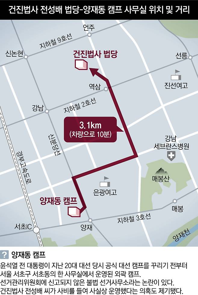 공직선거법 등에 따르면 대통령 선거 예비후보 및 후보가 선거사무소를 설치할 때에는 선거관리위원회에 신고해야 한다. 윤 전 대통령은 2021년 7월 12일 20대 대선 예비후보로 등록했다. 당시 공식 선거 캠프는 서울 광화문 인근의 이마빌딩이었다. 양재동 캠프는 신고되지 않았다. ‘불법 대선 캠프’ 의혹이 나오는 이유다. 또한 정치자금법에 따르면 정치자금은 정치활동을 위해 소요되는 경비로만 지출돼야 하고, 사적 경비로 지출되면 안 된다.