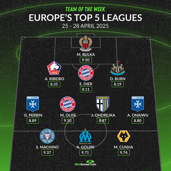 축구 통계 사이트 ‘후스코어드는 29일(한국 시각) 유럽 5대 리그 이 주의 팀을 선정했다. 3-4-3 전형으로 구성된 가운데, 마치노는 전방 스리톱 일원으로 뽑혔다. 마치노 옆에는 각각 해트트릭을 기록한 아민 구이리(25·마르세유)와 1골 2도움을 올린 마테우스 쿠냐(25·울버햄튼)가 위치했다.