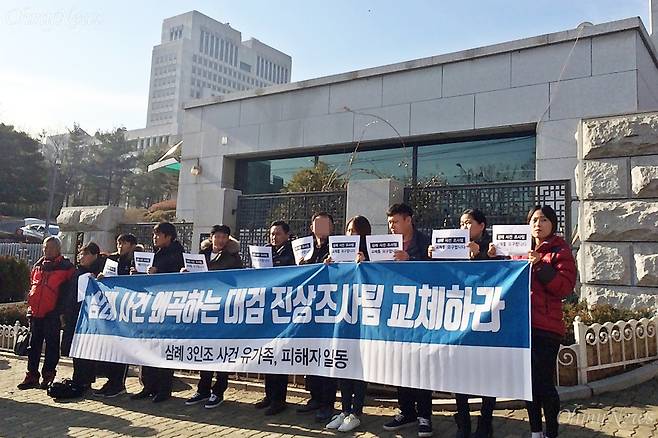 | ▲ '삼례 나라슈퍼 3인조 살인사건'의 범인으로 몰려 옥살이를 했다가 재심을 통해 무죄를 선고받은 3명과 유족 등이 검찰과거사위원회의 진상조사 결과와 당시 사건을 맡았던 최성우 전 검사의 손해배상청구 소송에 항의하며 2018년 12월 21일 오전 대검찰청 앞에서 기자회견을 열었다. |