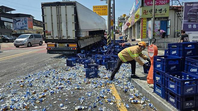이 사고로 인명피해는 없었으나 300박스 규모의 술이 든 맥주병이 도로에 쏟아졌고, 소방 당국 등이 수습하는 동안 일부 차로가 한때 통제됐습니다.