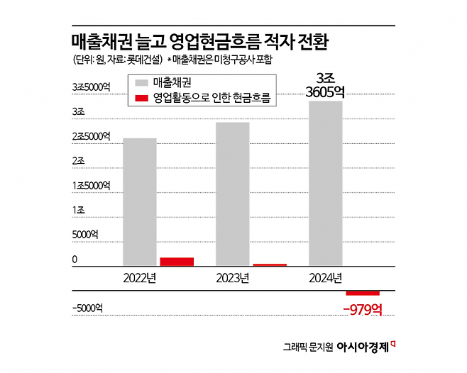 공사미수금과 분양미수금 등 아직 받지 못한 돈인 매출채권은 3년째 증가했다. 공사는 했지만 청구서를 보내지 않은 미청구공사비(계약자산)도 함께 늘었다. 매출채권과 미청구공사비를 합한 금액은 레고랜드 사태 직전인 2021년 2조2100억원 수준이었다. 하지만 이후 매해 불어나 지난해 3조3600억원대로 커졌다. 매출채권은 실제로 돈을 받지 않아도 장부에는 매출로 잡힌다.