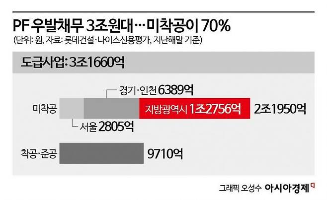 롯데건설 PF 우발채무 가운데 도급사업 규모는 지난해 말 기준 3조1660억원이다. 이 중 위험 수준이 높은 미착공 PF 보증이 2조1950억원(69%)에 달한다. 미착공 PF 보증 사업장은 수도권(9194억원)보다 지방(1조2756억원)에 많다. 또 착공 및 준공 사업(9710억원) 가운데 분양률이 70% 미만인 사업장은 2318억원 규모에 이른다.