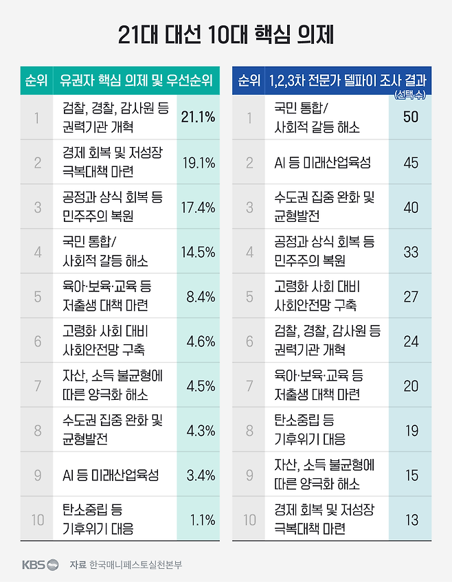 ■ 유권자 1순위 '권력기관 개혁'…전문가 1순위 '국민 통합'
