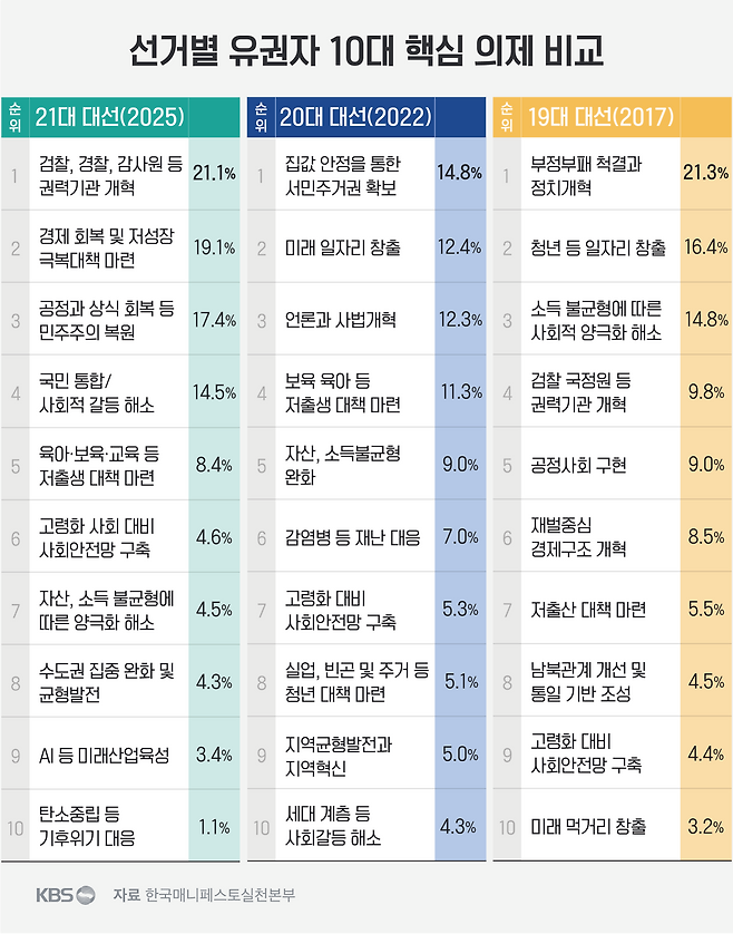 일반 유권자들이 꼽은 1순위 의제는 '검찰, 경찰, 감사원 등 권력기관 개혁'(21.1%)이었습니다. 2순위는 '경제 회복 및 저성장 극복대책 마련'(19.1%), 3순위는 '공정과 상식 회복 등 민주주의 복원'(17.4%)이었죠.