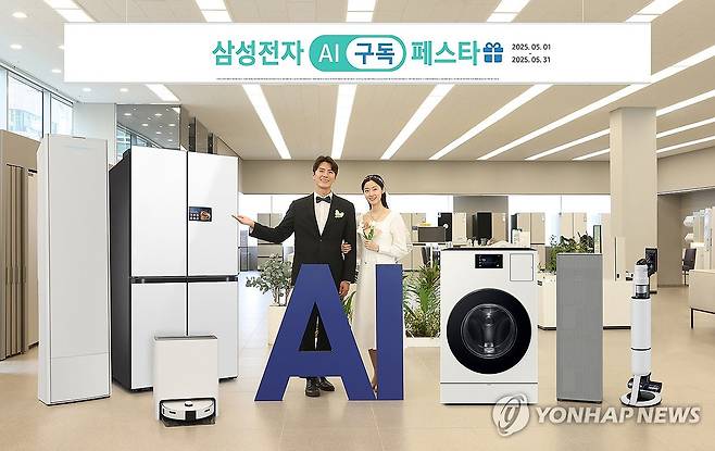 (서울=연합뉴스) 삼성전자가 가정의 달을 맞아 가전부터 PC까지 AI 제품을 만나볼 수 있는 'AI 구독 페스타'를 다음 달 1일부터 한 달간 진행한다고 30일 밝혔다. 삼성전자 모델들이 'AI 구독 페스타' 행사 제품을 소개하고 있다. 2025.4.30 [삼성전자 제공. 재판매 및 DB 금지]