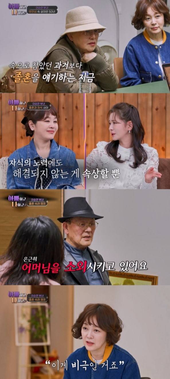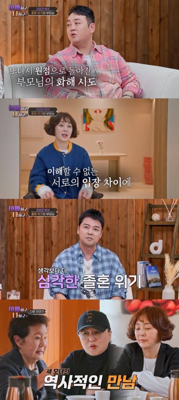29일 방송된 TV CHOSUN '아빠하고 나하고'에서는 이승연이 졸혼을 선언한 길러준 엄마와 아빠 사이의 회복을 위해 부부상담 자리를 마련했다. 상담사와 먼저 만난 길러준 엄마는 그간 쌓였던 아빠의 죄에 대해 털어놓았다.