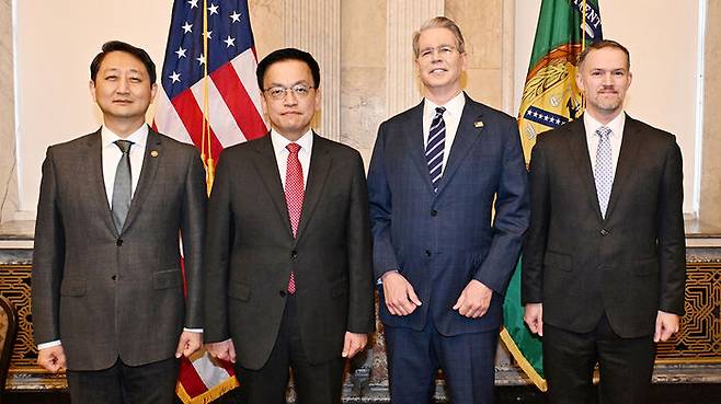 ▲ 최상목 부총리 겸 기획재정부 장관이 안덕근 산업통상자원부 장관과 함께 24일(현지시간) '한-미 2+2 통상협의에서 기념 촬영하고 있다. (왼쪽부터) 안 산업부 장관, 최 부총리, 스콧 베센트 미 재무장관, 제이미슨 그리어 미국무역대표부(USTR) 대표.