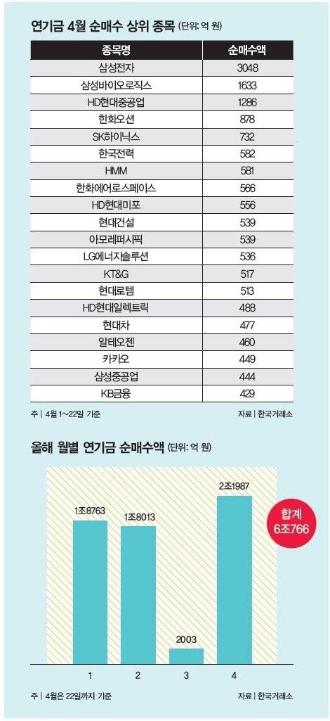 최근 국내 증시에서 대규모 순매수를 기록하고 있는 연기금을 두고 온라인 투자 커뮤니티 이용자들이 나눈 의견이다. 한국거래소에 따르면 연기금은 올해 들어 6조 원 넘는 매수세를 나타냈다. 특히 4월에는 한 달이 채 되기도 전(1~22일)에 2조1987억 원어치를 순매수했다(그래프 참조). '트럼프발(發) 관세전쟁'에 증시가 폭락하자 '낙폭 과대'로 판단하고 저가 매수에 나선 것이다. 연기금의 대부분을 차지하는 국민연금공단은 지난해 15%로 역대 최고 수준의 운용수익률을 거뒀다. 이에 증시가 하락할 때 연기금이 담은 종목들에 이목이 쏠리고 있다.