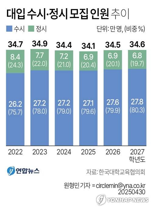 (서울=연합뉴스) 원형민 기자 = 한국대학교육협의회는 30일 전국 195개 회원대학이 제출한 '2027학년도 대학입학전형시행계획'을 취합해 공표했다.