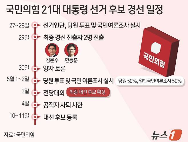 (서울=뉴스1) 윤주희 디자이너 = 국민의힘 대선 경선 결선이 탄핵 반대파(반탄)와 찬성파(찬탄)를 대표하는 김문수·한동훈 후보 간의 양자 대결로 압축됐다. 반(反)이재명 구도가 막판 변수로 떠오는 가운데 76만여 명에 달하는 '당원 표심'이 상당한 영향력을 행사할 전망이다.