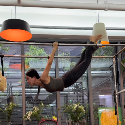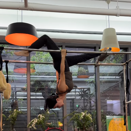 거꾸로 매달린 채로 다리를 옮기는 고난도 동작을 거뜬히 소화하며 공중에서 자유자재로 동작을 바꾸는 모습이 감탄을 자아낸다.