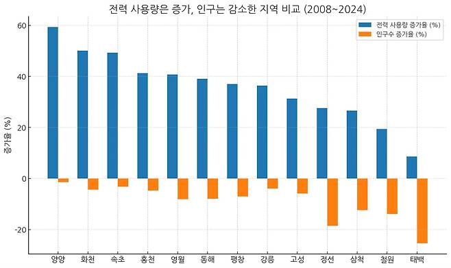 | ▲ 강원도내에서 인구수가 감소한 지역의 주택용 전력 사용량 증가율과 인구수 증가율을 비교한 그래프다. |