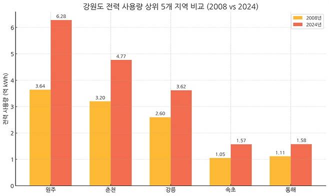| ▲ 강원도 내 주택용 전력 사용량 상위 5곳의 2008년, 2024년 비교 그래프다. |