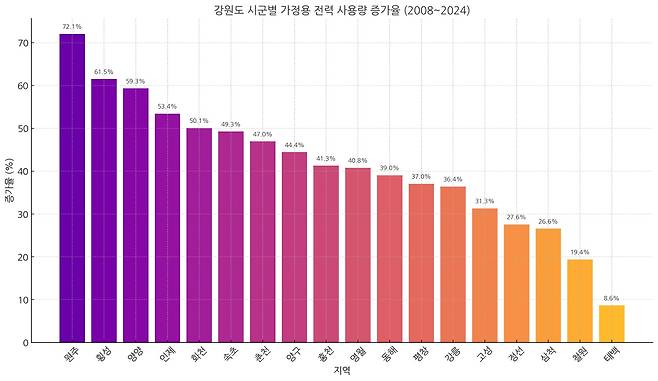 한국전력공사 전력데이터개방포털 사이트에서 제공하는 전력 통계를 살펴본 결과 2008년부터 2024년까지 강원특별자치도(강원도)의 주택용 전력 사용량은 46.6%, 고객 수는 32.7% 증가했다. 반면 같은 기간 강원도의 인구는 고작 1.47% 늘어난 것에 불과했다.