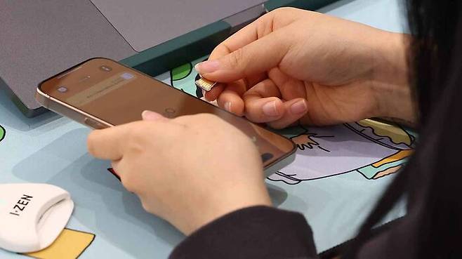 ▲ SK텔레콤이 유심 무료 교체 서비스를 시작한 지난 28일 서울 시내 한 SKT 대리점에서 직원이 유심 교체를 하고 있다.