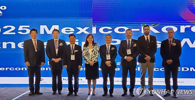 왼쪽부터 김지엽 코트라 중남미지역본부장, 페르난도 마예르 데리우 멕시코 경제부 국장, 강경성 코트라 사장, 예이드콜 폴렌스키 멕시코 상원의원, 허태완 주멕시코 대사, 페르난도 트레비뇨 멕시코기업인연맹 부회장, 호세 마리아 발렌수엘라 멕시코 에너지부 국장, 움베르토 에스케다 멕시코대외무역위원회 한-멕기업위원장. 2025.4.30