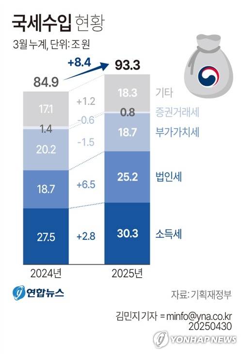 (서울=연합뉴스) 김민지 기자 = 기획재정부가 30일 발표한 '3월 국세수입 현황'에 따르면 올해 3월 국세 누계 수입은 전년 동기 대비 8조4천억원 많은 93조3천억원을 기록했다.