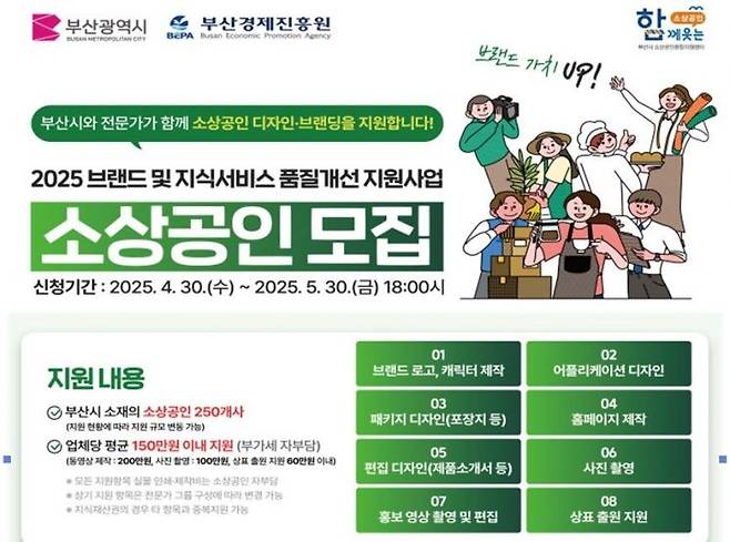 부산시와 부산경제진흥원은 지역 소상공인의 브랜드 경쟁력 강화를 위해 '2025년 소상공인 브랜드 및 지식서비스 품질개선 지원사업'을 추진한다고 30일 알렸다.