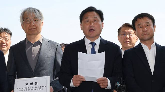 ▲ 김영진 전정권정치탄압대책위원회 위원장 및 위원, 문재인 전 대통령 변호인단이 30일 경기도 과천시 정부과천청사에서 공수처에 문재인 전 대통령 관련 이창수 서울중앙지검장 등 검사들에 대한 고발장 제출에 앞서 기자회견을 하고 있다.