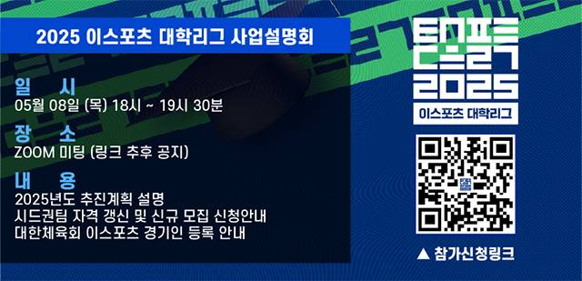 올해 대학리그가 본격적인 시작에 앞서, 오는 5월 8일(목) 오후 6시에 사업설명회를 개최한다. 사업설명회는 대학리그에 관심있는 대학생, 이스포츠 동아리, 교수, 대학 관계자 등 누구나 온라인으로 참여할 수 있다. 주요 내용은 ▲2025년도 추진 계획 및 연간 일정 ▲시드권팀 자격 갱신 및 신규 모집 신청 안내 ▲학교 축제 프로모션 지원 ▲’e유니언즈’ 프로그램 소개 ▲이스포츠 경기인 등록 안내 등이다. 사업설명회 참가 신청은 초청장 이미지 내 QR코드 또는 온라인 설문지 링크를 통해 5월 7일(수) 오후 5시까지 가능하다.