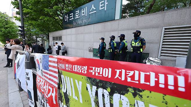 오전 10시 현재 10명 안팎의 지지자와 유튜버들은 서초동 아크로비스타 정문 앞에서 "압수수색 즉각 중단하라", "검찰은 귀가하라" 등의 구호를 외치며 검찰에 항의 중입니다.