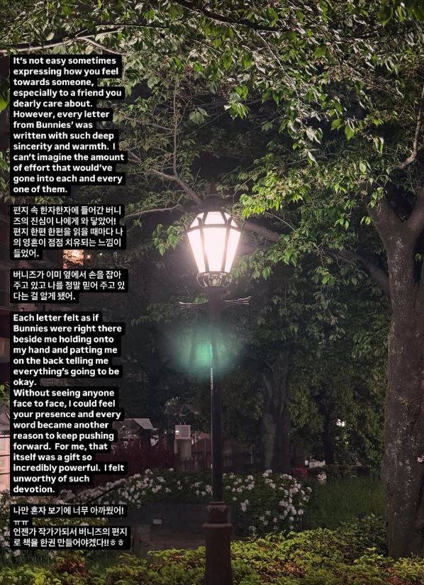 끝으로 그는 "직접 만나고 안아줄 기회가 없어도 언제나 우린 서로에게 큰 힘이 되어주며 좋은 에너지를 전하고 있을 거다"라며 "가장 힘든 순간 나의 버팀목이 되어줘서 터널 끝에 항상 빛을 비춰줘서, 무엇보다 끊임없이 나랑 멤버들을 믿어줘서 진심으로 고맙다"라며 재차 응원과 지지에 감사를 전했다.