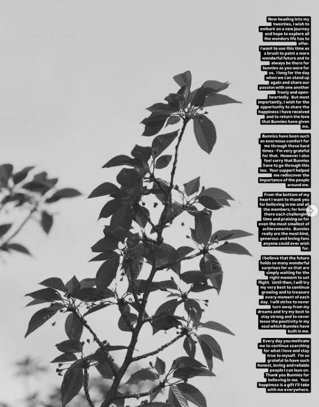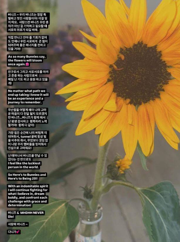 다니엘은 "버니즈(팬덤명)가 보내준 많은 편지들을 읽으면서 많은 생각과 감정이 느껴졌다. 몰랐던 여러가지에 대해 배우게 됐다"며 "작은 단어 하나하나의 힘이 얼마나 대단한지, 한 문장의 소중함이 얼마나 클 수 있는지, 글의 아름다움이 얼만큼 심장을 울리게 할 수 있는지. 무엇보다도 버니즈가 얼마나 강하고 마음이 따뜻한지 다시 한번 진심으로 느끼고 알게 됐다"고 말했다.
