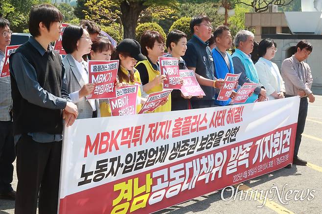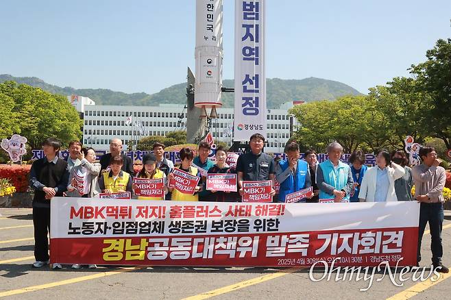 | ▲ 4월 30일 오전 경남도청 정문 앞에서 열린 ‘MBK 먹튀 저지, 홈플러스 사태 해결, 노동자-입점업체 생존권 보장을 위한 공동대책위원회’ 발족 선언. |