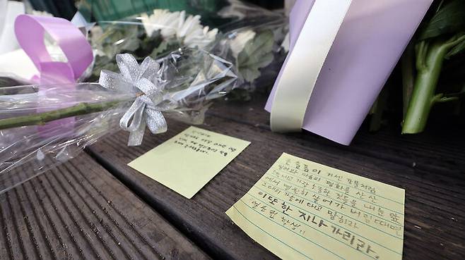 ▲ 지난 2월 14일 경기 시흥시의 한 편의점 앞에 추모의 글귀가 적힌 쪽지와 국화 꽃다발, 간식 등이 놓여있다.