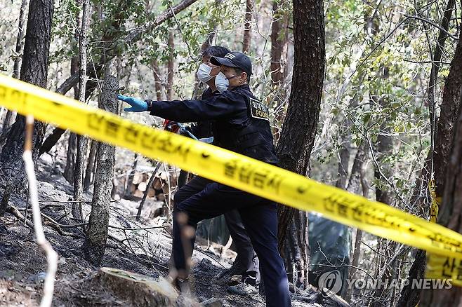 (대구=연합뉴스) 김현태 기자 = 대구에서 발생한 대형 산불이 이틀 만에 진화됐다가 일부에서 재발화한 가운데 30일 대구 북구 노곡동 최초발화지 현장에서 산림청, 경찰, 소방 등 유관기관 관계자들이 현장감식을 하고 있다. 2025.4.30