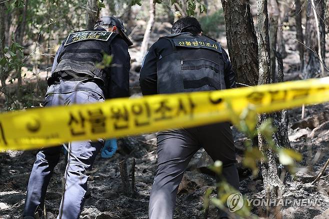 (대구=연합뉴스) 김현태 기자 = 대구에서 발생한 대형 산불이 이틀 만에 진화됐다가 일부에서 재발화한 가운데 30일 대구 북구 노곡동 최초발화지 현장에서 산림청, 경찰, 소방 등 유관기관 관계자들이 현장감식을 하고 있다. 2025.4.30