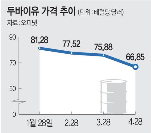 한국석유공사 유가정보시스템 오피넷에 따르면 두바이유는 지난 1월 17일 배럴당 84.61달러(약 12만848원)까지 오른 뒤, 지난 28일 기준 66.85달러(9만5482원)로 급락했다. 국제 휘발유 가격과 국제 경유 가격 모두 곤두박질쳤지만 미국과 중국 간 협상 기대감 등으로 최근 다시 꿈틀거리고 있다.