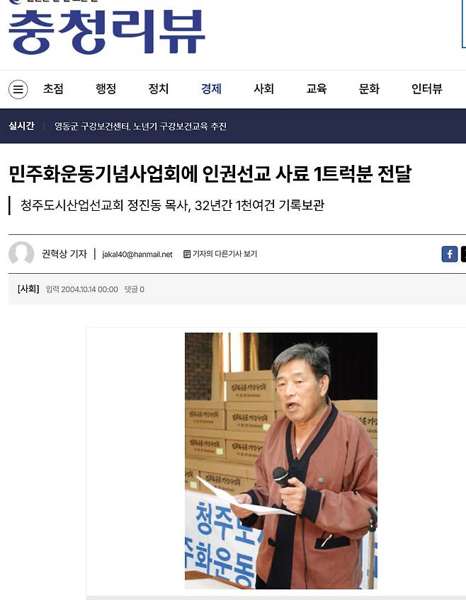 애지중지 키운 딸을 시집보내는 기분이었을까? 정진동은 30여 년간 활동해 온 청주도시산업선교회의 역사, 아니 충북지역 민주화운동의 역사를 시집(?) 보냈다. 민주화운동기념사업회에 청주산선 자료를 기증한 것이다.