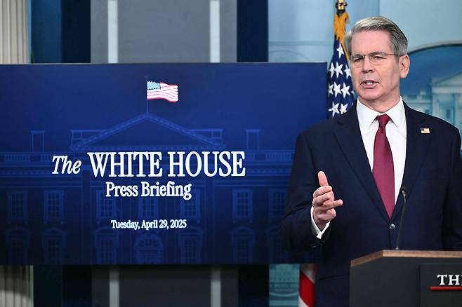 | ▲ 29일(현지시간) 미국의 스콧 베선트 재무부 장관이 워싱턴 DC 백악관에서 진행한 도널드 트럼프 대통령 취임 100일 경제 성과 브리핑에서 발언하고 있다. |