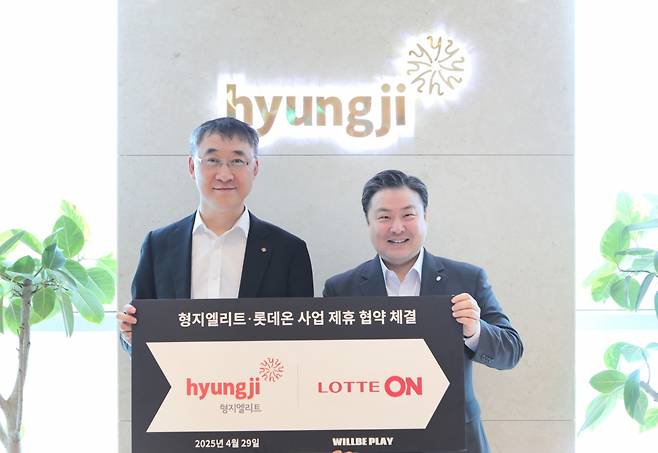 최준호 형지엘리트 대표이사(오른쪽)와 롯데쇼핑 e커머스사업부 박익진 대표가 29일 인천 송도 형지글로벌패션복합센터에서 진행된 협약식에서 형지 엘레트와 롯데쇼핑의 e커머스 플랫폼 롯데온(LOTTE ON)과 업무제휴협약을 체결한 후 기념사진을 찍고 있다. (사진=형지엘리트)