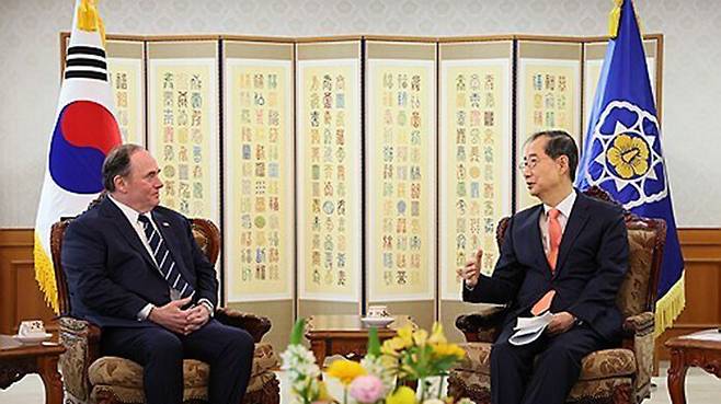 ▲ 한덕수 대통령 권한대행 국무총리가 30일 정부서울청사에서 방한 중인 존 펠란 미 해군성 장관을 접견하고 있다.
