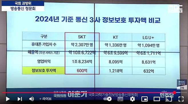 | ▲ 30일 열린 국회 과학기술정보방송통신위원회 SKT 해킹 사태 청문회에서 이훈기 더불어민주당 의원이 공개한 통신 3사 정보보호투자액 비교. |