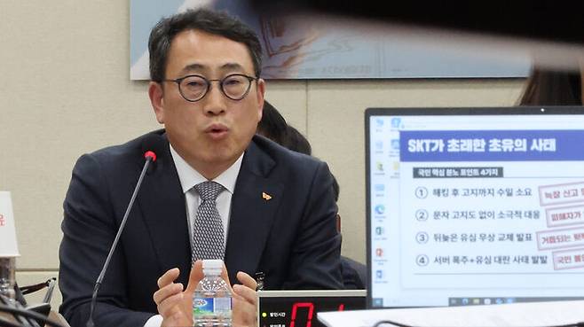 ▲ 유영상 SK텔레콤 대표이사가 30일 국회 과학기술정보방송통신위원회의에서 열린 방송통신 분야 청문회에서 유심 해킹 사태에 대한 위원 질의에 답하고 있다.