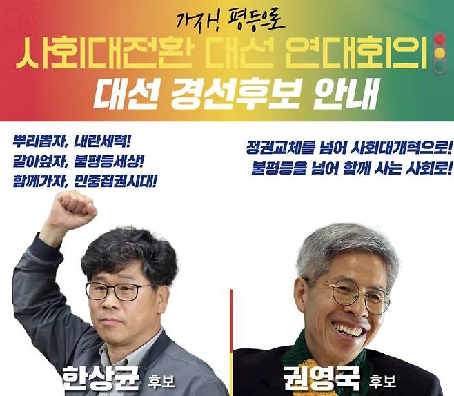 | ▲ 현재 연대회의 후보는 권영국 정의당 대표와 한상균 전 민주노총 위원장이다. 어느 쪽이 후보로 확정이 되든 정의당을 포함한 연대회의 참가단체들은 해당 후보를 지지하고 함께 대선을 준비하기로 합의한 것으로 알려졌다. |