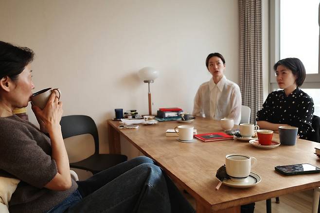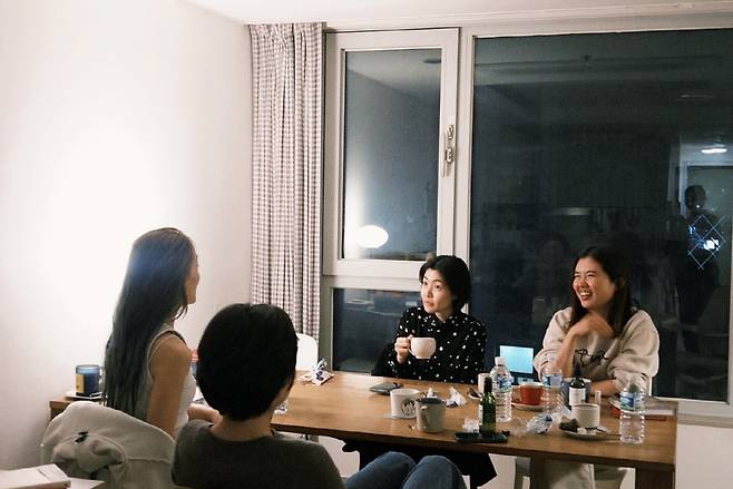 이들은 정서경 작가의 작업실로 알려진 곳에서 차와 음료를 함께 즐기며 진지한 대화를 나누는 모습.