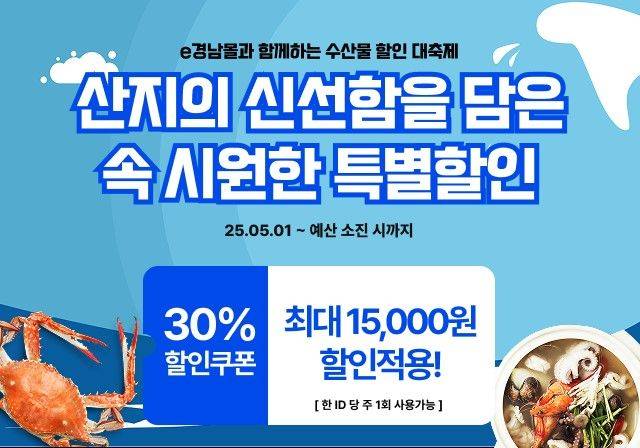 소비자는 경남 특산 수산물을 온라인으로 손쉽게 구매할 수 있고, 30% 할인쿠폰을 통해 최대 1만5000원 할인 혜택을 받을수 있다.