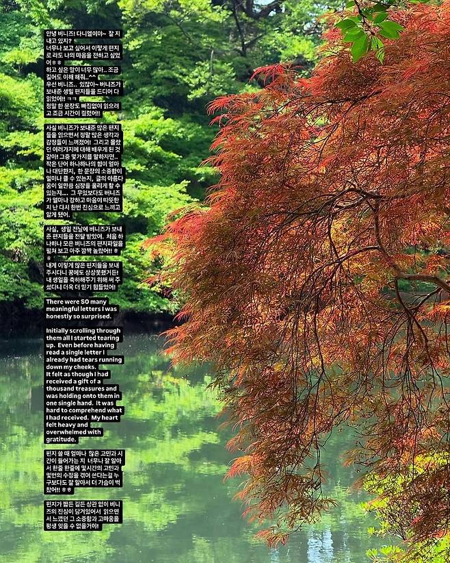 이어 그는 "각각의 편지를 읽을 때마다 버니즈의 진심이 내게 전해졌고, 내 영혼이 치유되는 느낌을 받았다. 버니즈가 항상 나를 믿어주고 옆에서 손을 잡아주고 있다는 걸 알게 되었다"며 "비록 직접 만나서 안아줄 기회는 없지만, 우리는 서로 큰 힘이 되어주며 좋은 에너지를 나누고 있다는 걸 잊지 말자"고 강조했다.