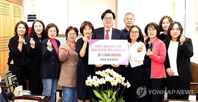 (서울=연합뉴스) 박일하 동작구청장이 30일 서울 동작구 동작구청에서 영남지역 산불 피해복구 지원을 위한 대방동 통장협의회가 모금한 성금을 전달받은 후 통장들과 기념 촬영하고 있다. 2025.4.30 [서울 동작구 제공. 재판매 및 DB 금지]