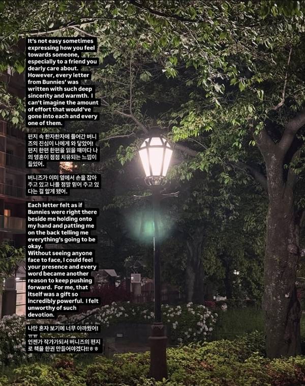 편지 한 줄 한 줄이 치유였고 버니즈가 잡아주는 손을 느꼈고 정말 마음 깊이 느꼈어요.