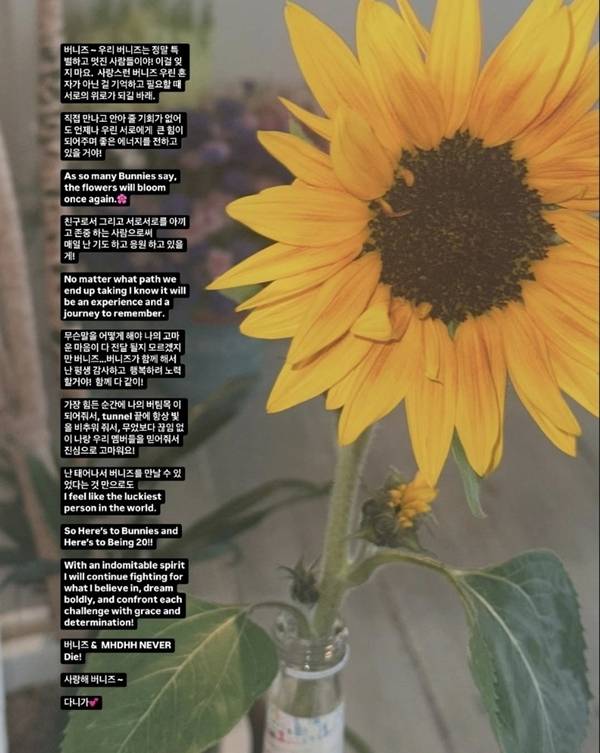 또한 “이 만남은 우연보다 끈연(끈질긴 인연)”이라며 “버니즈와 함께해서 평생 감사하고 행복하다”는 말로 편지를 마무리했다.
